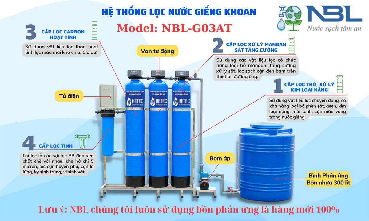 Chức năng xử lý: Xử lý nước giếng khoan nhiễm sắt, mangan, mùi tanh, màu vàng đỏ.
